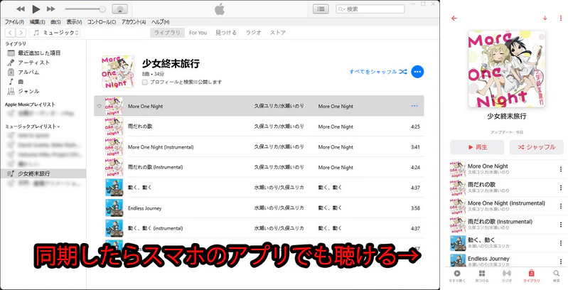 もし、Apple Music を加入しているなら、iTunes に自分の Apple ID をサインインして、認証すれば、プレリストに追加したローカル音楽ファイルを同期することもできます。同期すれば、パソコンに接続して、音楽を転送する必要もなく、Apple Music アプリでプレリストにある曲をストリーミング再生できます。(同期された音楽の後ろにある点線の曇マークは消えます。)